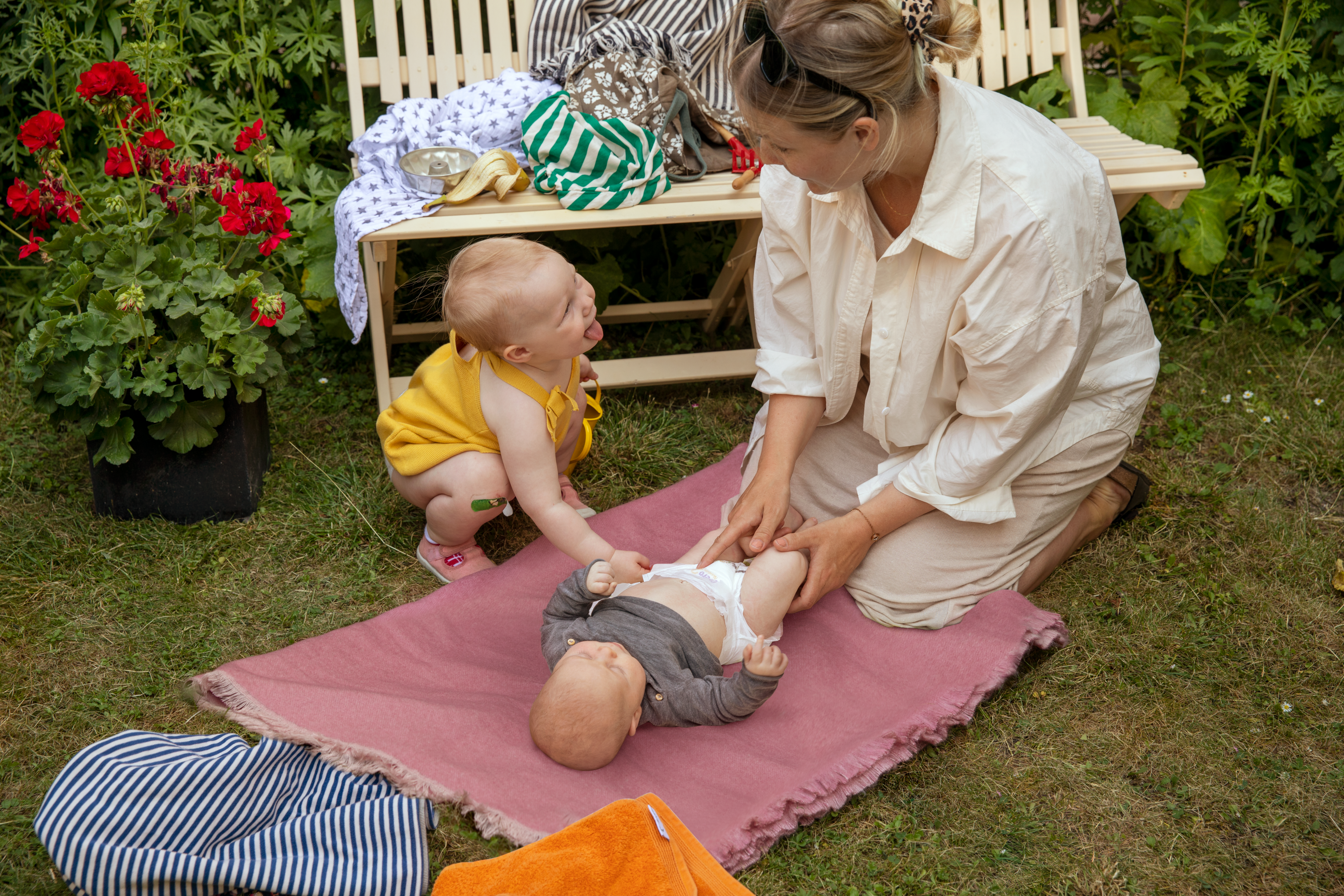 - Husk, at det kan være klogt at klæde barnet i tøj, der er nemt at tage af, når du skal skifte ble, fx bukser eller bodyer, som kan knappes op i skridtet.