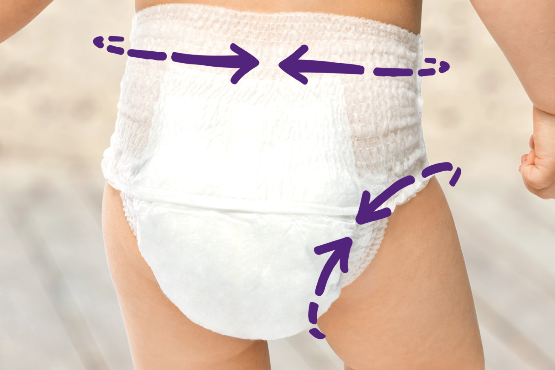 Tag den på som et par almindelige underbukser. Træk en finger rundt inden for elastikken om lårene for at sikre, at lækagebarriererne er foldet ud, så bleen er tæt. Riv begge sider op, når bleen skal skiftes.
